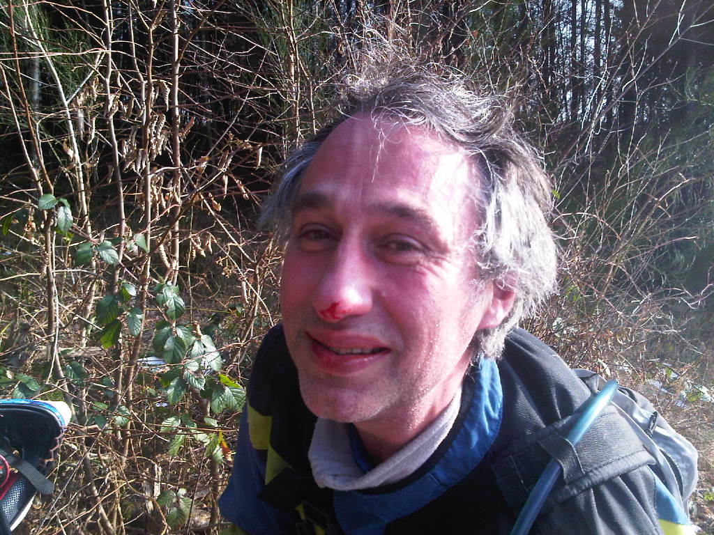Une belle plaie sur le bout du nez. Le beau casque tout neuf tapissé par du sang mélé à du bordeaux.