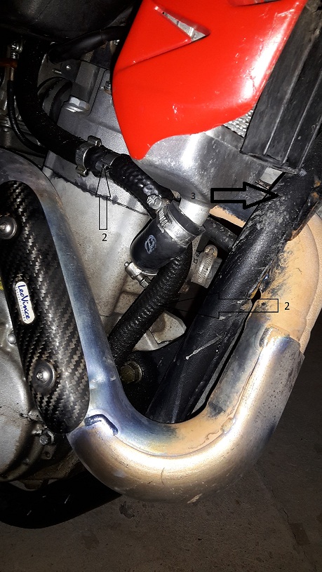 J'ai l'impression que ma moto chauffe jusqu'a ce qu'il y ai une fuite qui coule sur le coude du pot d'echappement et me donne une fumée blanche(qq residu sur le numero 3 sur les photo).