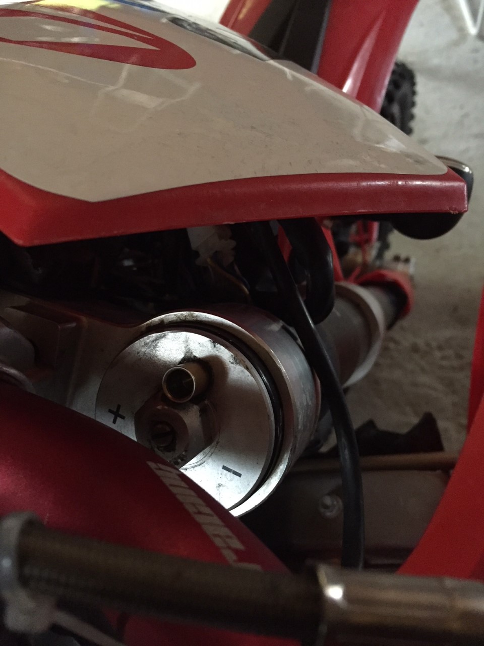 Enfin il me manque sur le sommet du fourreau Droit une vis de purge, valve de pression d'air a priori oû puis je trouver cela (voir photo) ?