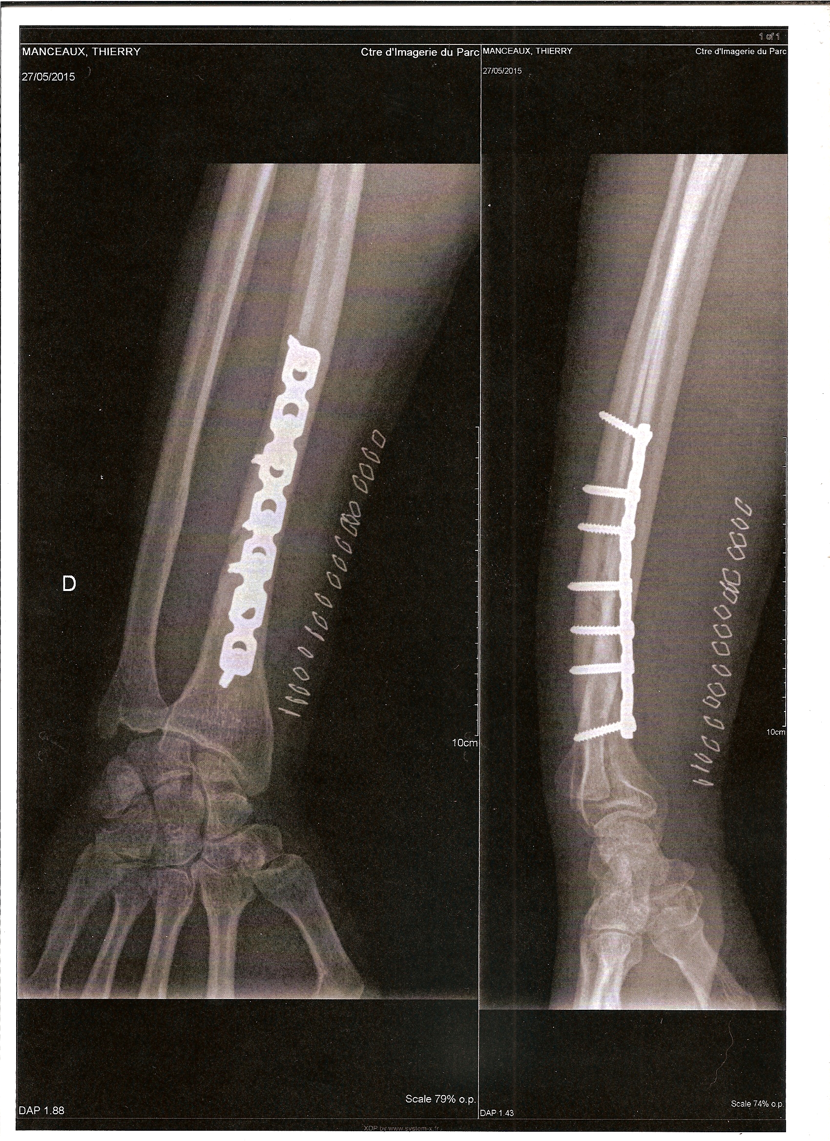 Ma fracture a nécessité un passage au bloc pour l’installation d'une plaque vissée, car la fracture était déplacée.
